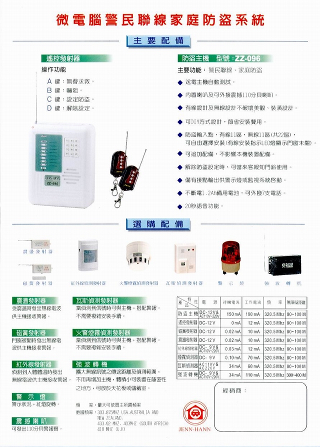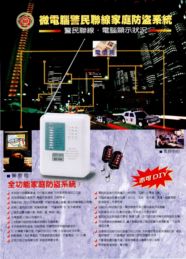 [ 型號:ZZ096 , 家庭 居家 保全 無線緊急求救 防盜器-全功能 ] [ 校園緊急求救系統-3564區-LED數位語音防盜器-安全防護-防盜器功能-適合學校 ; 社區 ; 機關警衛室 ] [ 型號:ZZ098 , 無線6區家庭防盜器 ] [ 型號:ZZ099 , 家戶聯防系統-16戶聯防 ] [ 型號:ZZ088-2 , 簡易型家庭防盜器 ] [ GSM-家庭防盜器 ] [ 居家庭防盜系統-型號:ZZ096-3 ] [ 電子,家用,老人呼叫鈴,無線呼叫器,緊急呼叫器,無線呼叫警報器 ] [ ★GO: 家庭防盜器週配件-導覽 ] [ ★GO:自動撥號報警機-首頁-導覽 ] [ ★GO:各種遙控開關遙控器-導覽 ] [ ★GO: 警示燈-導覽 ] [ ★GO: 警報喊話器,電動警報器-導覽 ] [ ★GO:3段式多功能遙控器運用 {一只滾碼遙控器可單獨遙控} , 汽車防盜遙控鎖 , 電動門遙控器 , 家庭防盜器-導覽 ] [ ★GO:汽車防盜與家庭防盜結合,當您的愛車放在你家樓下, 您可以與家庭防盜器結合 ] [ ● ★ 【 】 符號導覽說明 ]